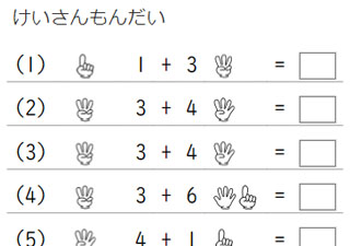 初めての足し算の練習に。小さい子が指を使って足し算をするイメージをプリントにしました。